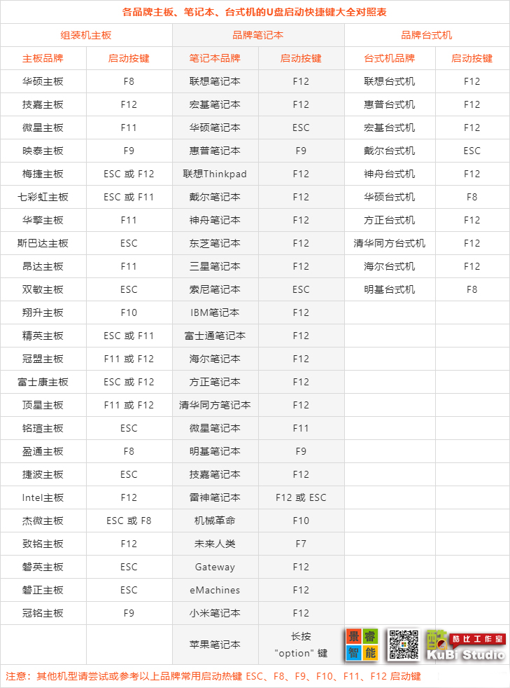 U盘启动快捷键大全